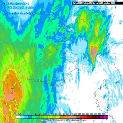Simulation des quantités de pluies attendues d’ici demain soir par le modèle AROME (meteociel.fr) |