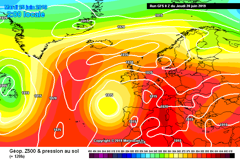 Selon les principaux modèles de prévision, un épisode caniculaire devrait se mettre en place en début de semaine prochaine, en lien avec l’isolement d’une goutte froide près du Portugal et de l’Espagne (voir carte ci-dessous). Parallèlement, l’anticyclone devrait prendre le dessus sur ce « petit » système dépressionnaire, induisant un flux de Sud sur notre territoire, avec un air chaud en provenance du Sahara.