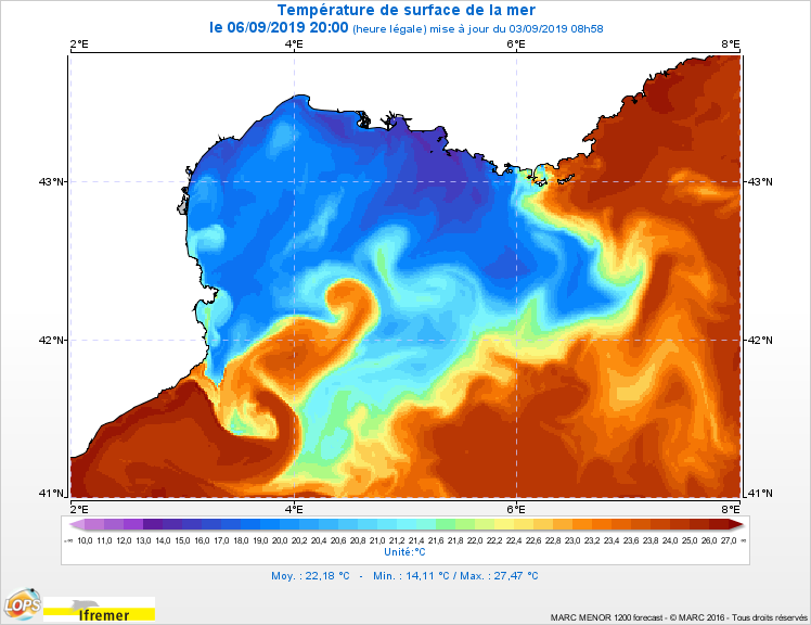 Phénomène habituel : en raison de vents régionaux qui vont souffler fortement ces prochaines heures (mistral et tramontane), la température de l’eau va baisser d’ici à vendredi dans le golfe du Lion, si bien qu’elle sera nettement inférieure à 20°C en fin de semaine, d’après les projections du modèle MARS3D Méditerranée (voir image ci-dessous, cliquez dessus pour l’agrandir).