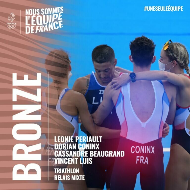 JO / Triathlon : deux montpelliéraines décrochent la médaille de bronze 0 Par La rédaction le 31 juillet 2021 Sports Léonie Périault et Cassandre Beaugrand, qui s’entraînent toutes les deux à Montpellier au sein du pôle France, ont décroché aux Jeux Olympiques la médaille de bronze avec l’équipe de France de relais mixte de Triathlon. 🇫🇷🚨 LE BRONZE POUR LE RELAIS MIXTEEEEEEE ! Première médaille de l'histoire en triathlon pour nos Français 🥉💪#AllezLesBleus #Tokyo2020 pic.twitter.com/URfLXsxck9— Equipe France (@EquipeFRA) July 31, 2021 Dernière mise à jour le 31 juillet 2021 à 10h36 Actualités